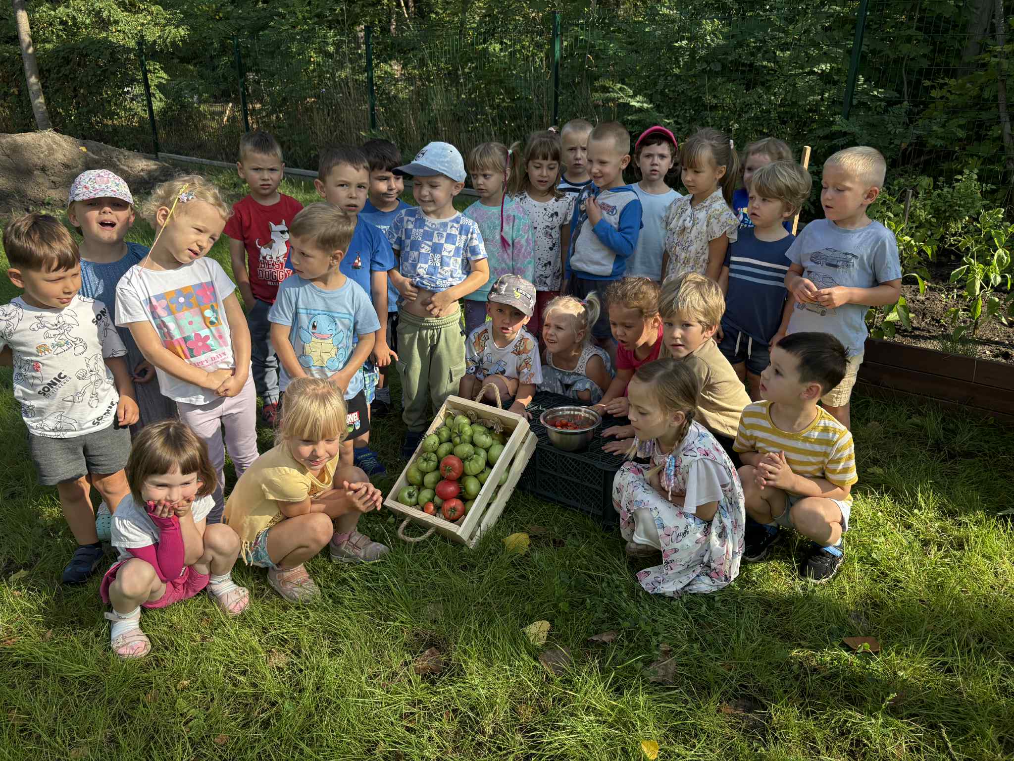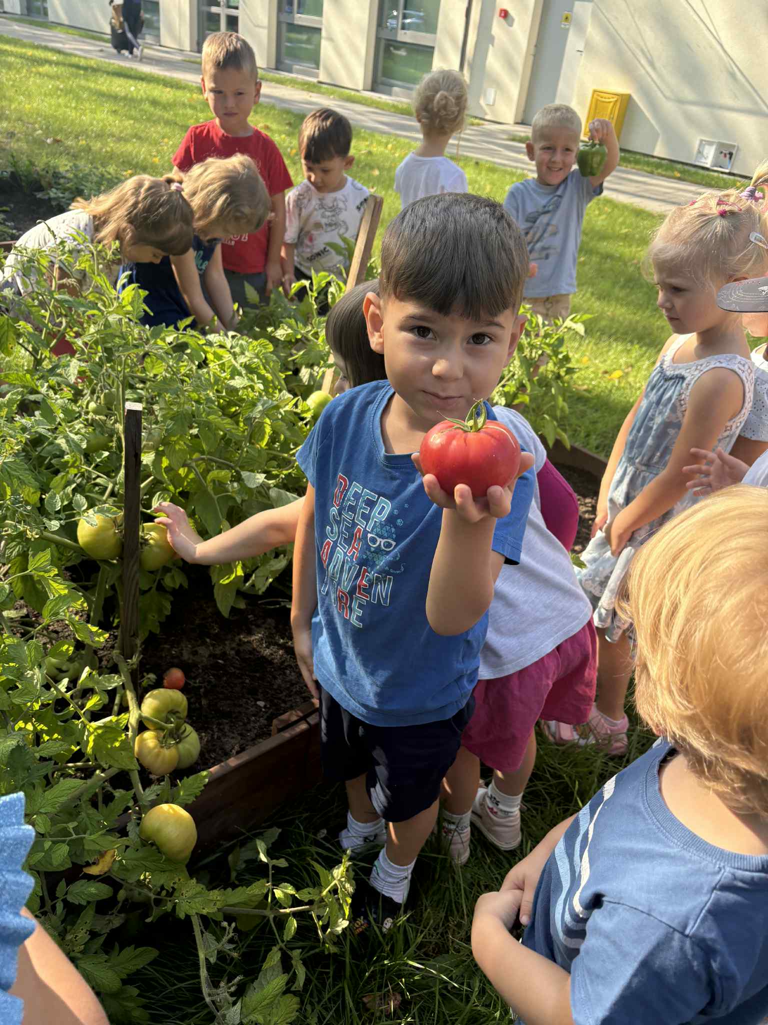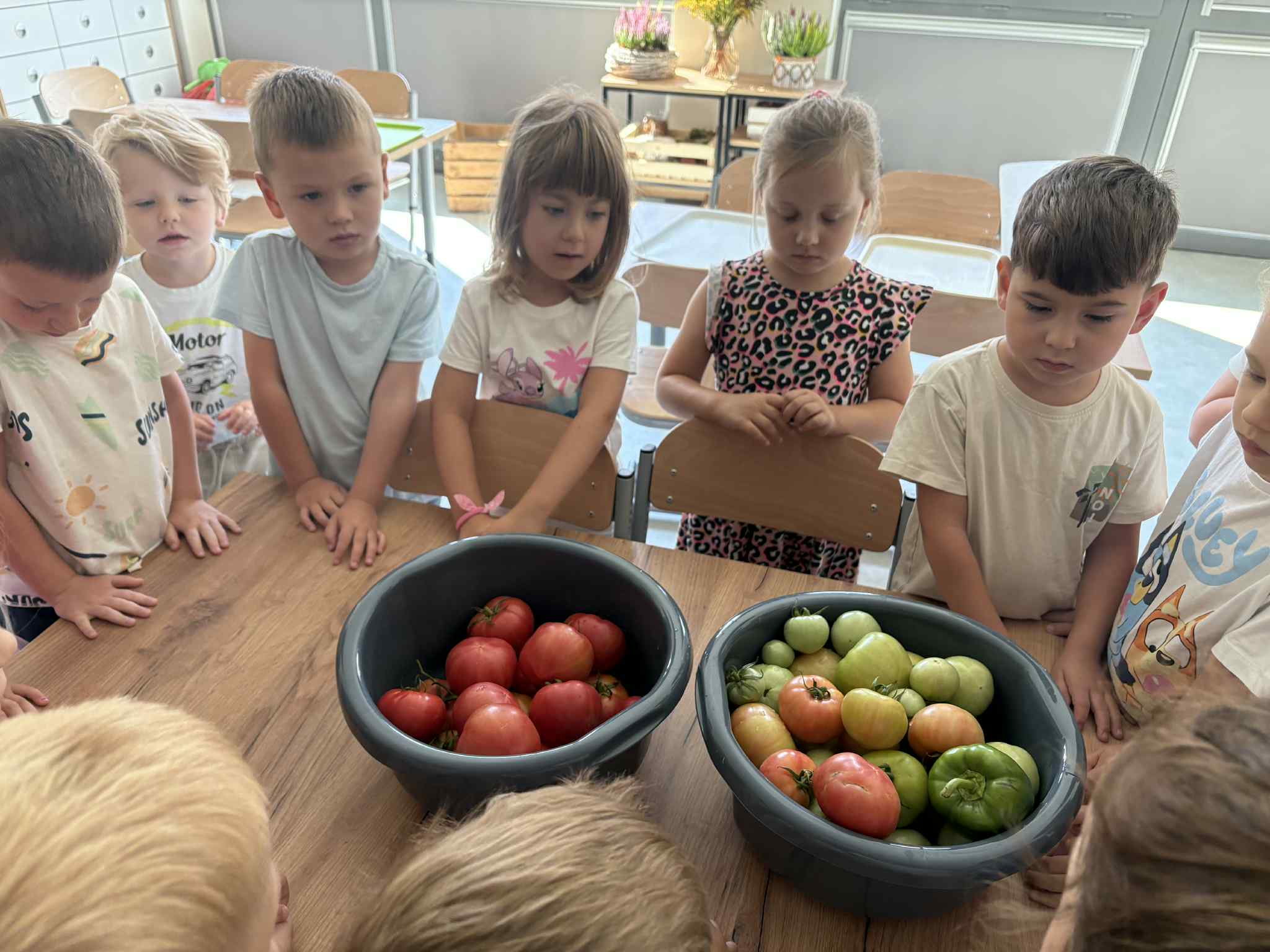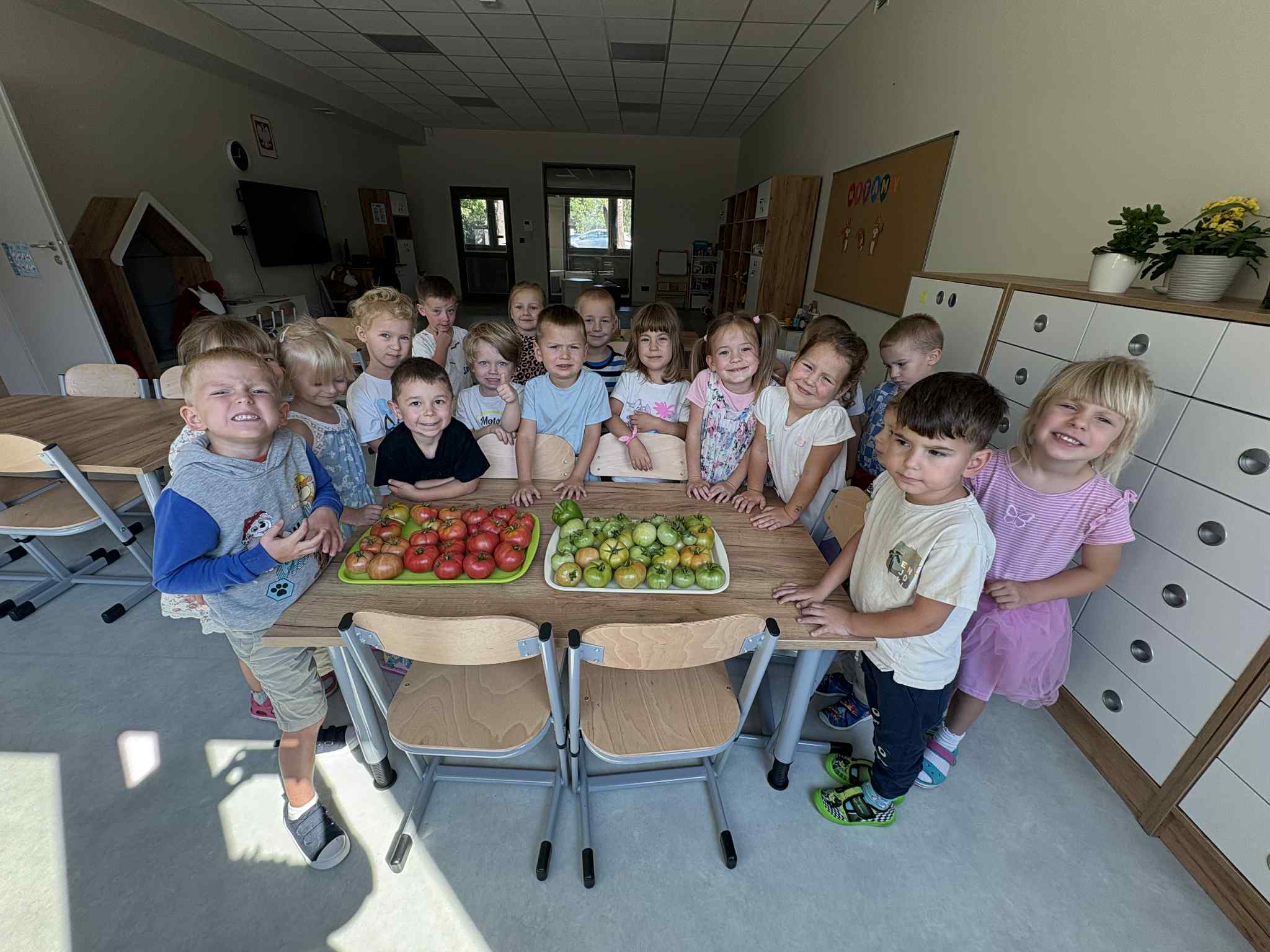 Na wiosnę dzieci z naszego przedszkola założyły własny warzywniak. Z zaangażowaniem podlewały grządki, obserwowały, jak rośliny rosną i uczyły się cierpliwości. Po wakacyjnej przerwie na dzieci czekała wyjątkowa niespodzianka – rośliny pełne dorodnych, pomidorów! Ich widok wywołał ogromną radość i dumę. Część pomidorków była jeszcze zielona, więc zabraliśmy je do naszej sali. Dzieci mogły każdego dnia obserwować, jak szybko dojrzewają, zmieniając barwę na intensywnie czerwoną. Przedszkolaki samodzielnie zerwały dojrzałe owoce, dokładnie je umyły, a potem ze smakiem zjadły na śniadanie. Okazało się, że własnoręcznie wyhodowane warzywa smakują najlepiej!
