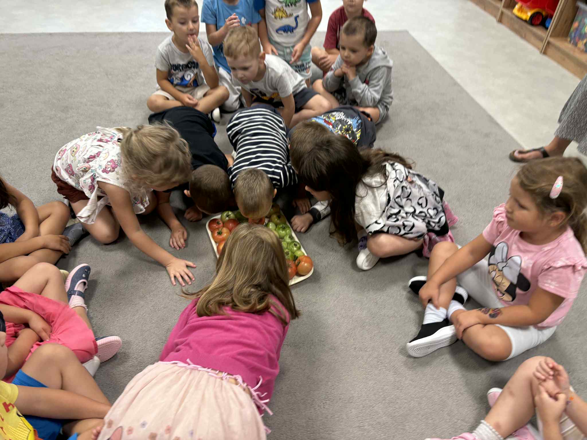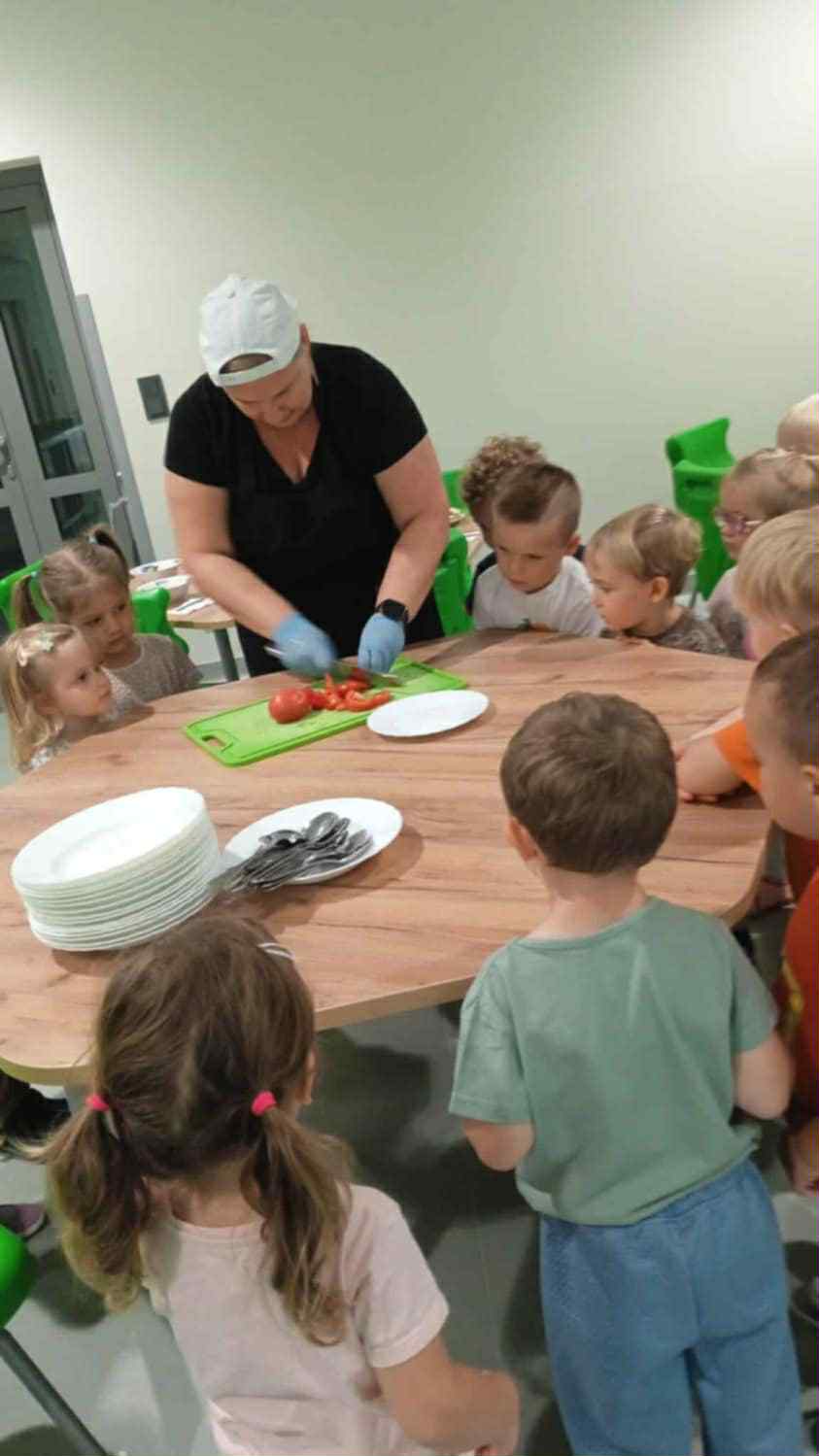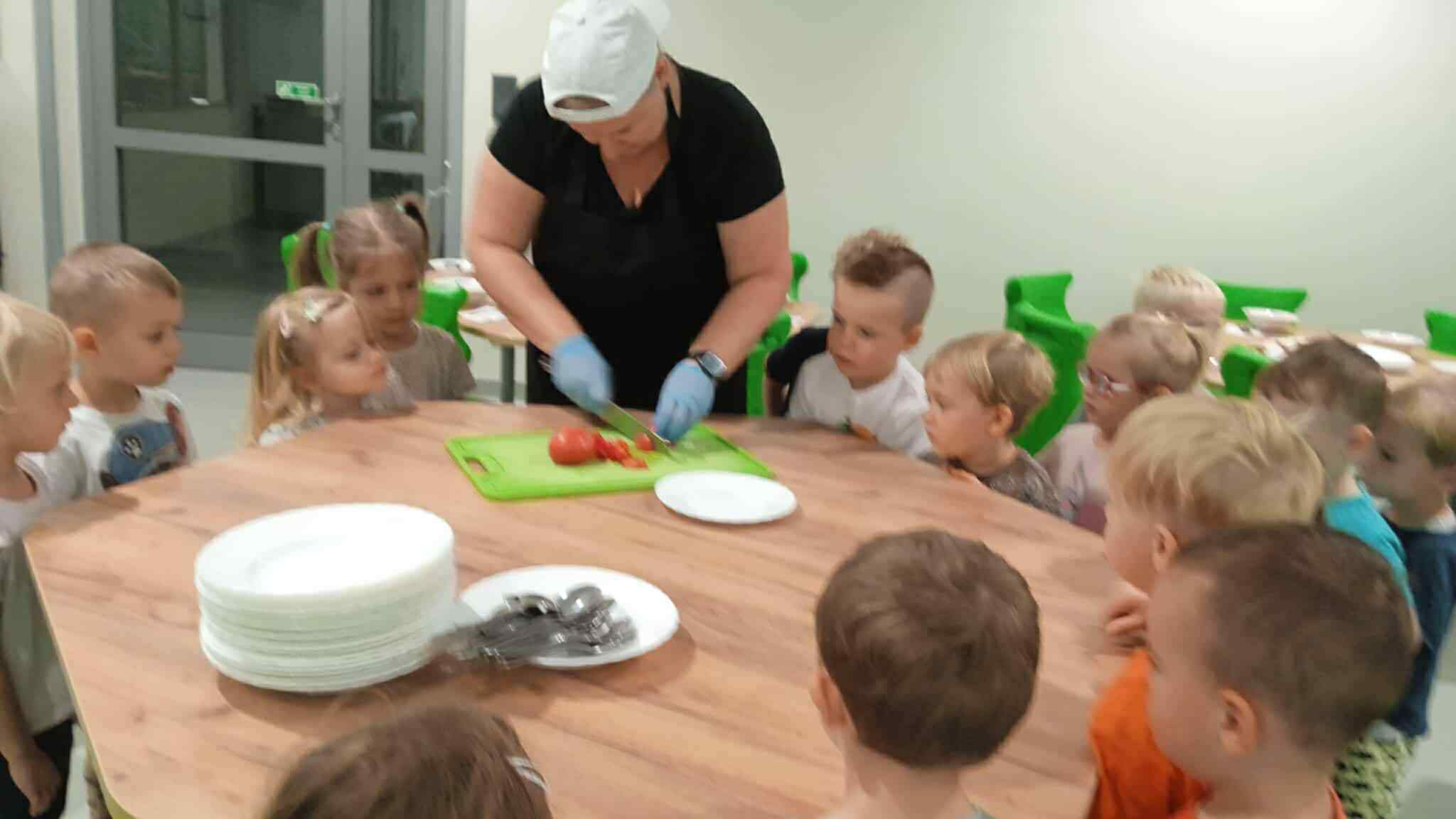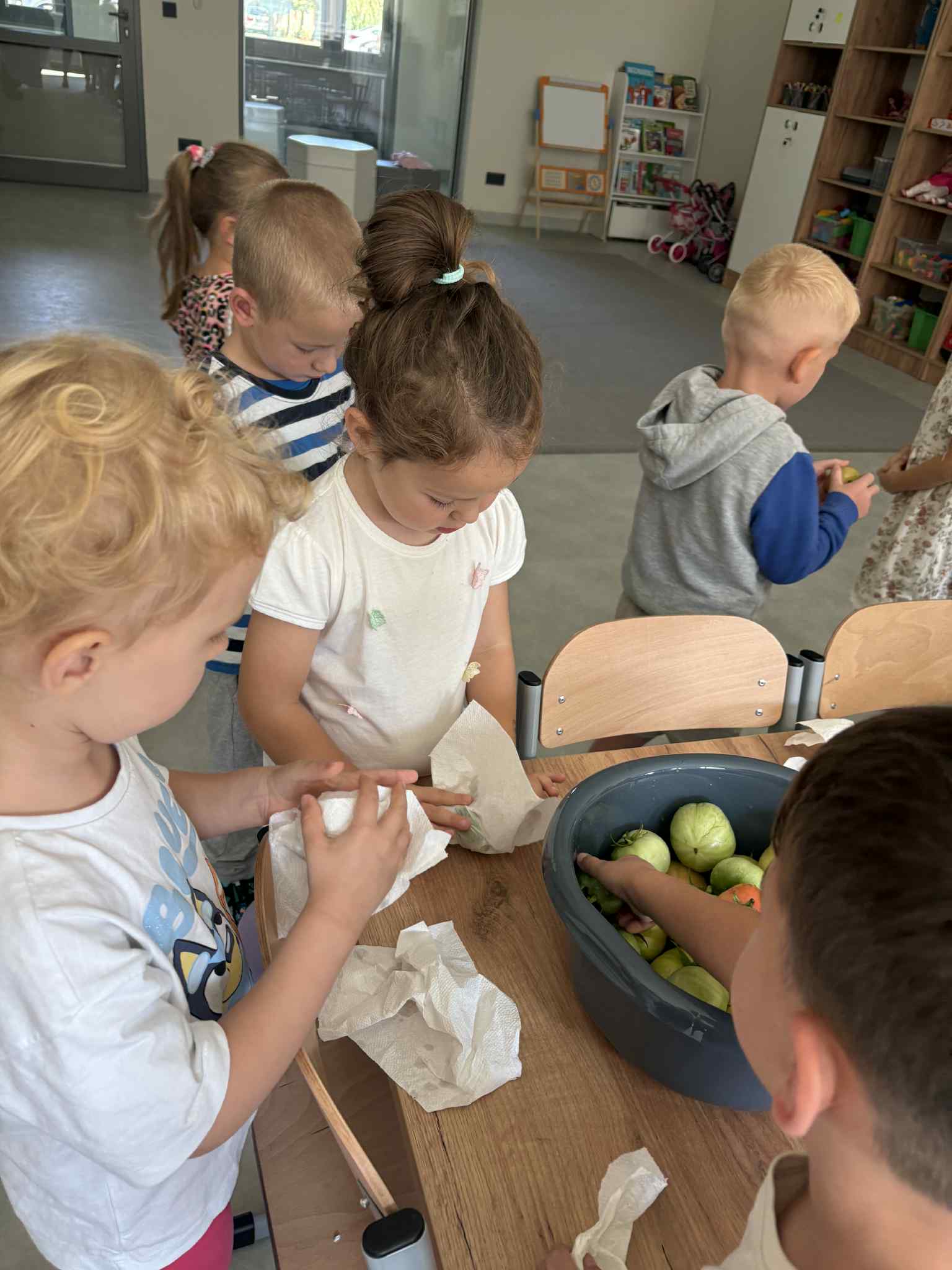Na wiosnę dzieci z naszego przedszkola założyły własny warzywniak. Z zaangażowaniem podlewały grządki, obserwowały, jak rośliny rosną i uczyły się cierpliwości. Po wakacyjnej przerwie na dzieci czekała wyjątkowa niespodzianka – rośliny pełne dorodnych, pomidorów! Ich widok wywołał ogromną radość i dumę. Część pomidorków była jeszcze zielona, więc zabraliśmy je do naszej sali. Dzieci mogły każdego dnia obserwować, jak szybko dojrzewają, zmieniając barwę na intensywnie czerwoną. Przedszkolaki samodzielnie zerwały dojrzałe owoce, dokładnie je umyły, a potem ze smakiem zjadły na śniadanie. Okazało się, że własnoręcznie wyhodowane warzywa smakują najlepiej!