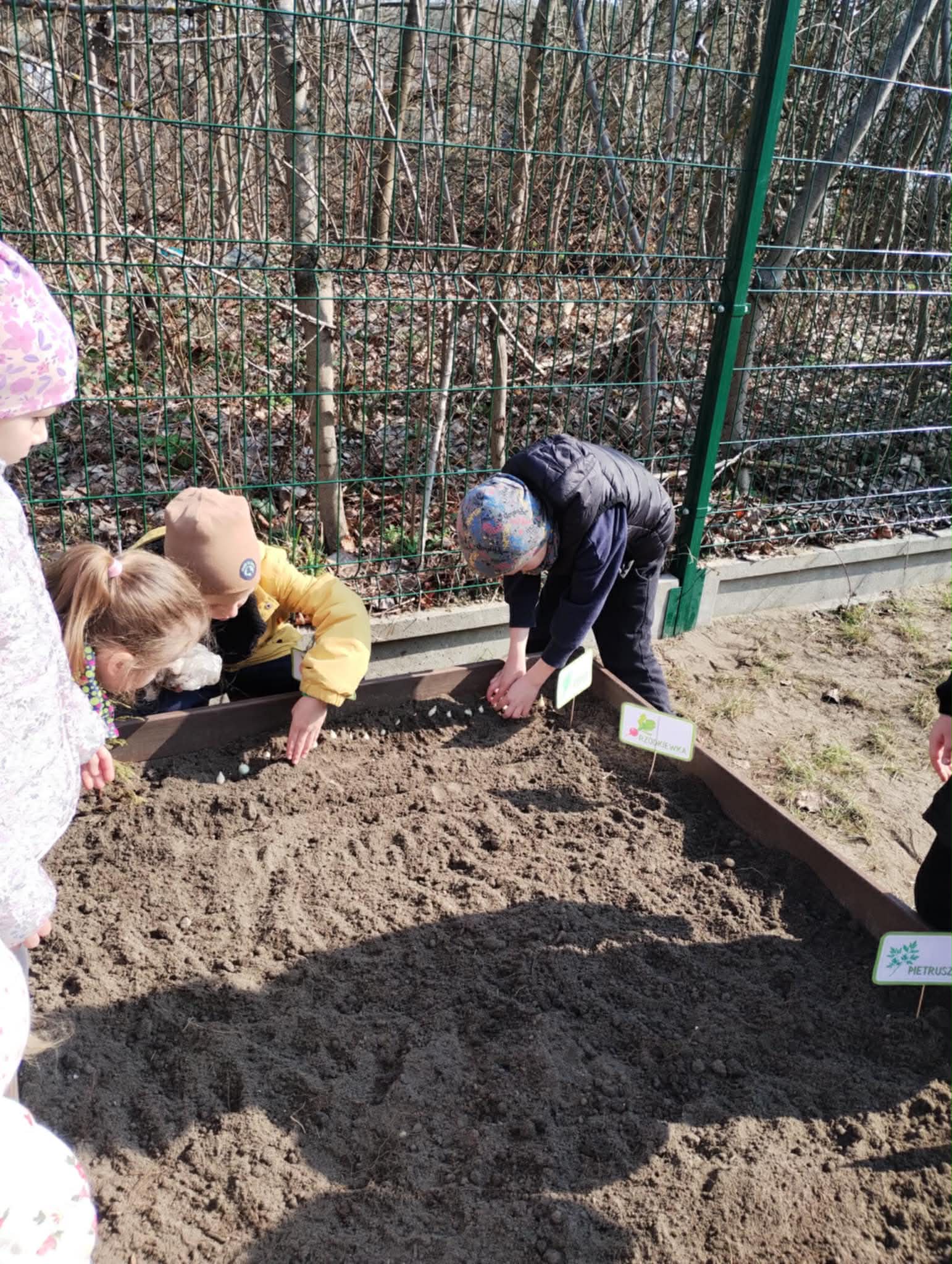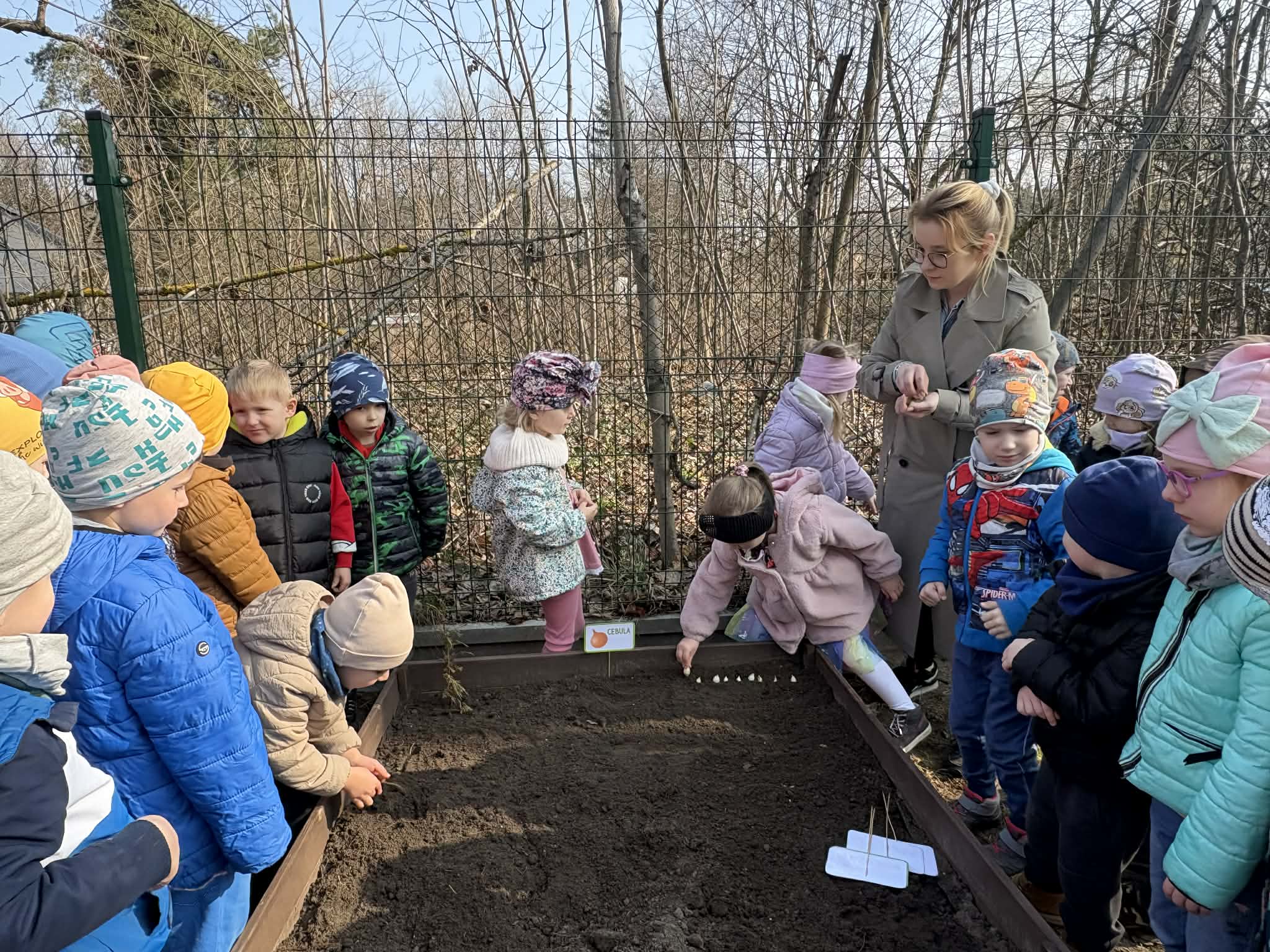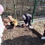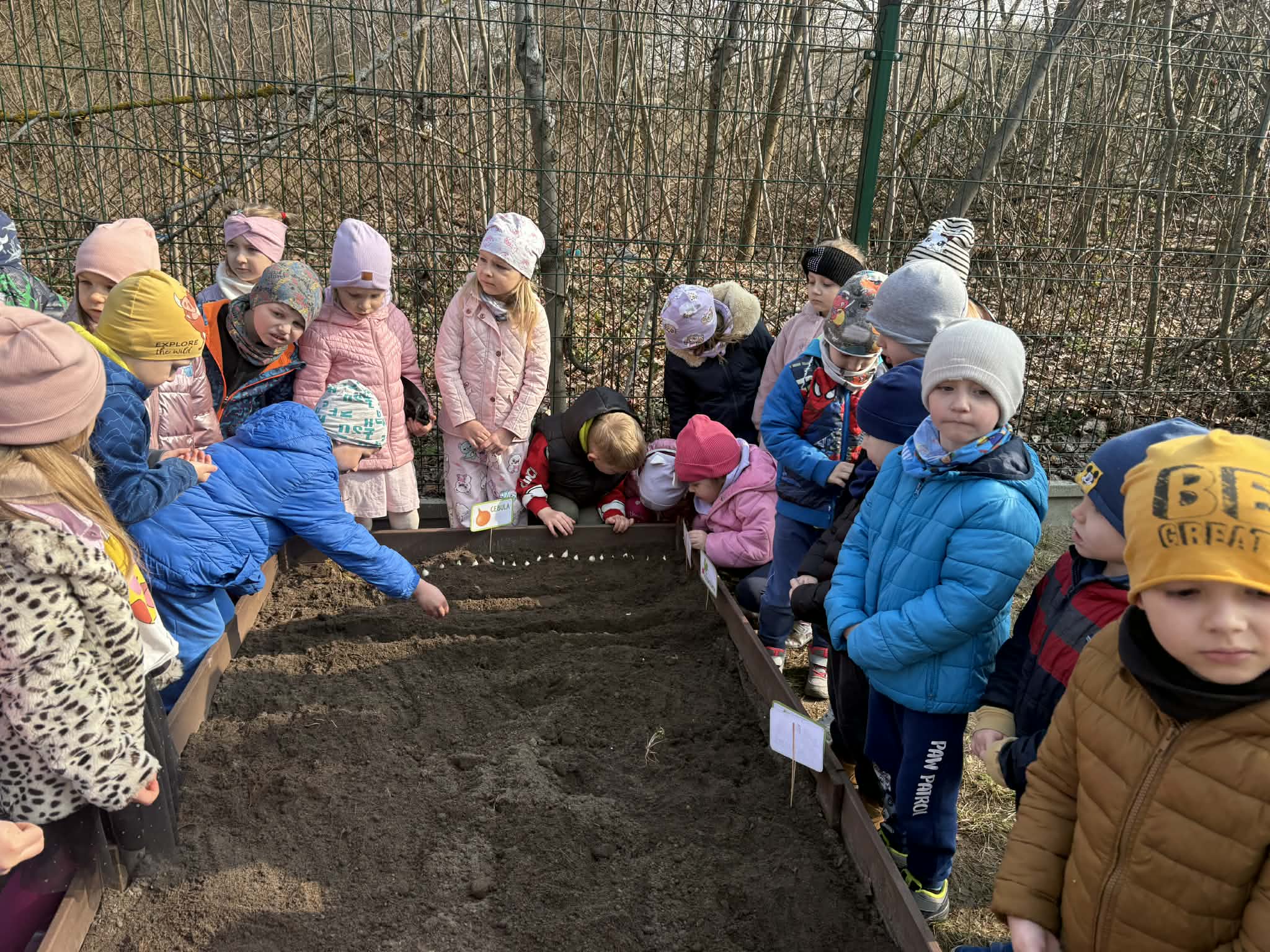 Zanim rozpoczęły sadzenie, dzieci przygotowały skrzynie – przy użyciu grabek usunęły stare liście oraz korzenie i odpowiednio przygotowały glebę. Następnie w skrzyniach na warzywa dzieci wysadziły cebulę oraz posiały szpinak, koperek i marchewkę. To była nie tylko świetna zabawa, ale również cenna lekcja przyrody. Dzieci dowiedziały się, jak powstają warzywa i jak ważna jest cierpliwość oraz regularna pielęgnacja roślin. Teraz z niecierpliwością będziemy obserwować, jak nasze warzywa rosną. Już nie możemy się doczekać pierwszych efektów!
